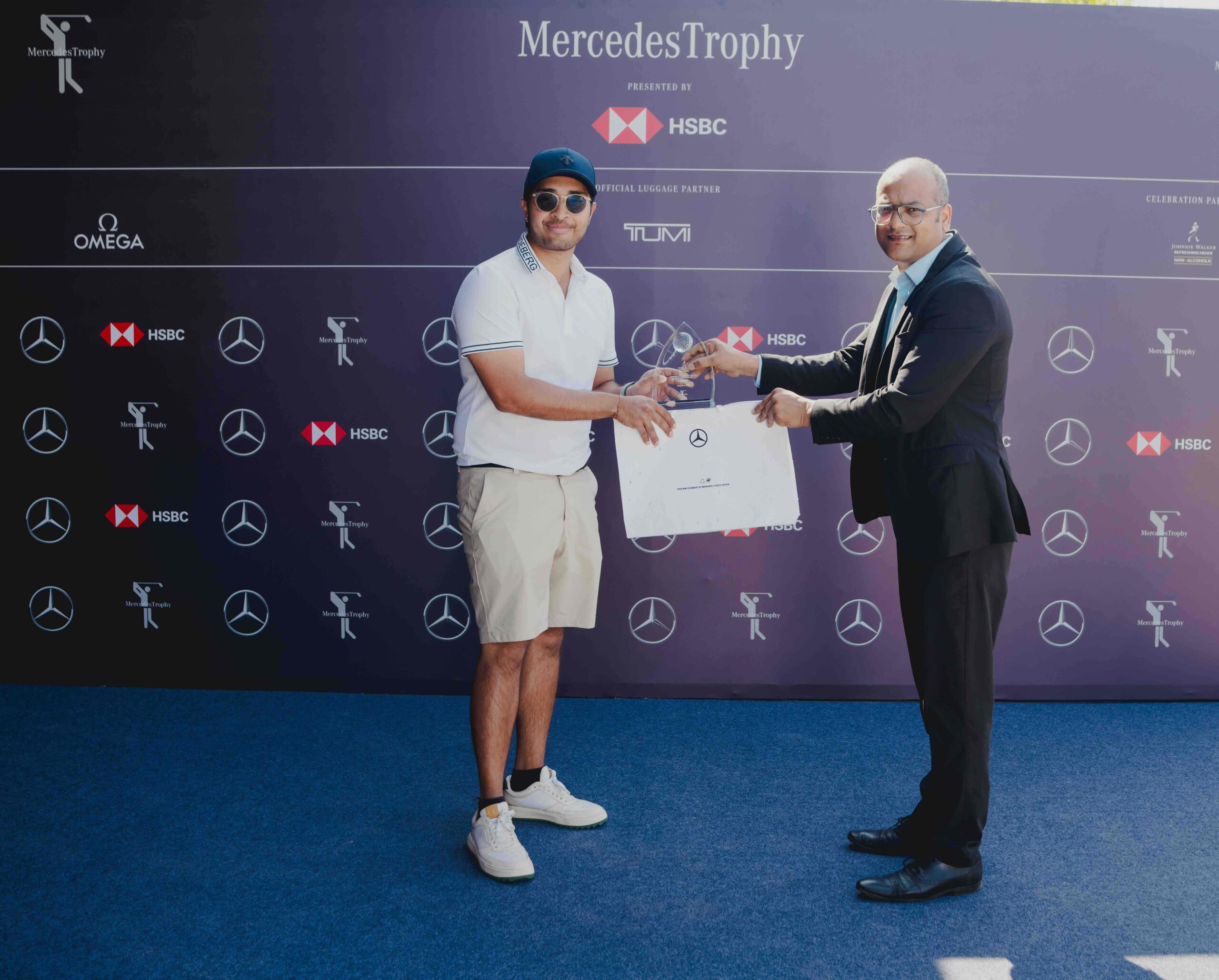 Day 1 – Akhileshwar Bhat (L) receiving the Longest Drive prize from Shambhu Chawla (R) – AVP, HSBC