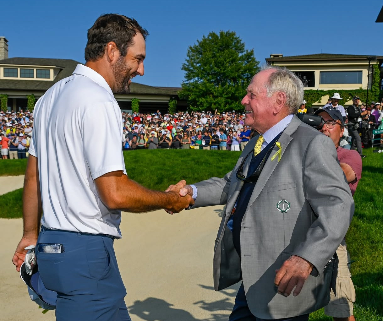 “Well, you did it again,” tournament host Jack Nicklaus (R) congratulates Scheffler (L)